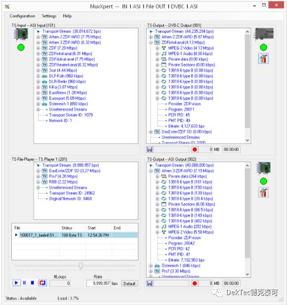 分享DekTec一款用于TS碼流復用、解復用軟件,可安裝運行于標準或者工業級PC上。配合我們輸入/輸出板卡,可支持TS碼流的任意輸入重新復用后到任意輸出。
