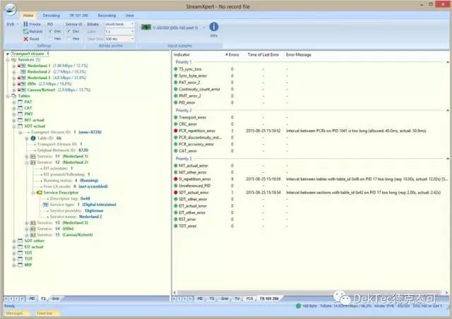 分享DekTec(德克泰可)行業標準MPEG-2傳輸流分析軟件。軟件可實時/離線分析關于PID,服務和表的詳細統計信息。同時,可以解碼視音頻節目。